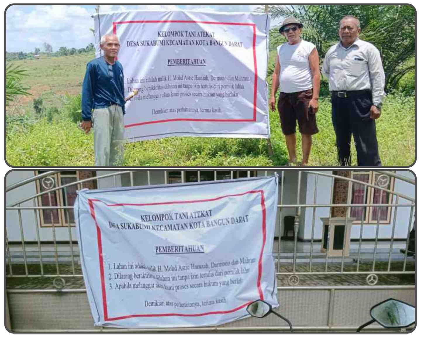 Ironisnya, spanduk yang semula terpasang di lokasi sengketa, justru ditemukan terpasang di pagar rumah milik Darmono.