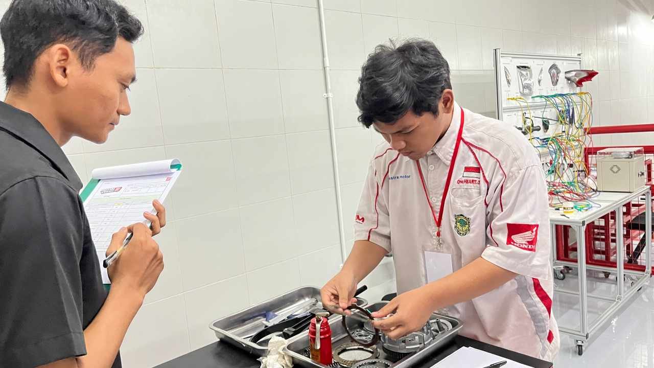 Para peserta didik dan guru dipacu untuk dapat menyelesaikan berbagai tantangan mulai dari materi uji pengenalan alat pengukuran, perawatan dan perbaikan sepeda motor Honda.