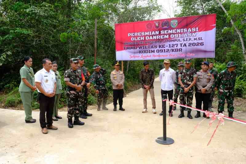 KUBAR, literasikaltim.comKomandan Korem 091/Aji Surya Natakesuma (ASN) Brigjen TNI Anggara Sitompul, S.I.P., M.Si., meninjau sekaligus meresmikan hasil pembangunan semenisasi jalan, yang dikerjakan melalui program TNI Manunggal Membangun Desa (TMMD) ke-127 Kodim 0912/Kutai Barat, di Kampung Linggang Amer, Kecamatan Linggang Bigung, Kabupaten Kutai Barat (Kubar), Rabu (11/3/2026).