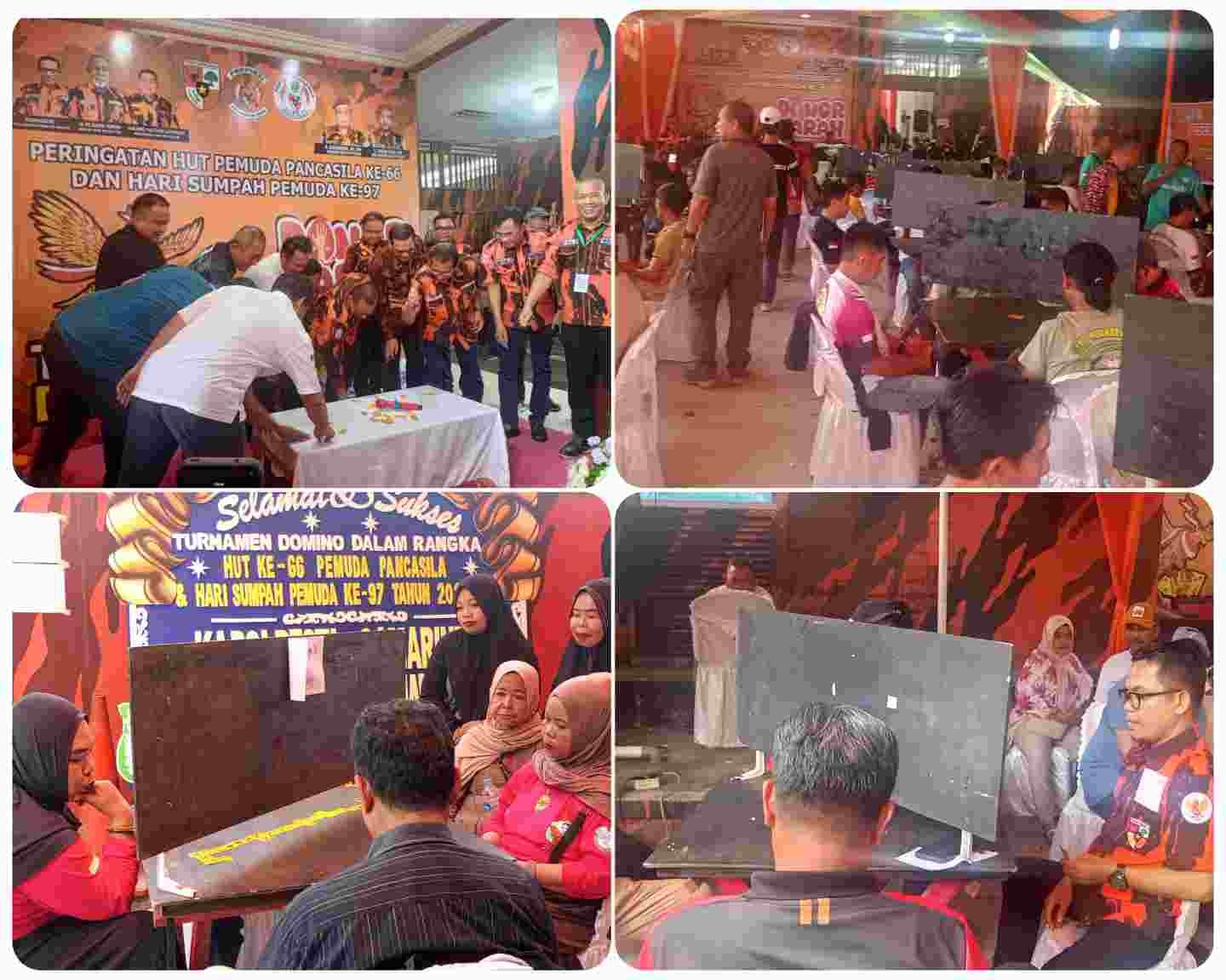 Kartu domino yang disusun dan dijatuhkan di meja menjadi simbol solidaritas dan semangat kebersamaan, sebagaimana nilai-nilai yang diusung Pemuda Pancasila selama enam dekade lebih.
